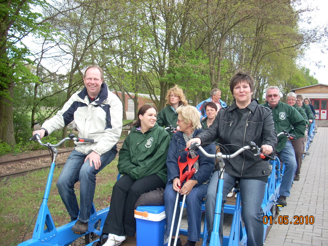 Mit dem Busunternehmen Heiko Öhlmann fuhr die ganze Schar nach Hann. Ströhen. zum Bahnhof der „ Auenland Draisinen“. Hier wurde dann in vierer Teams auf die Draisinen umgesattelt.