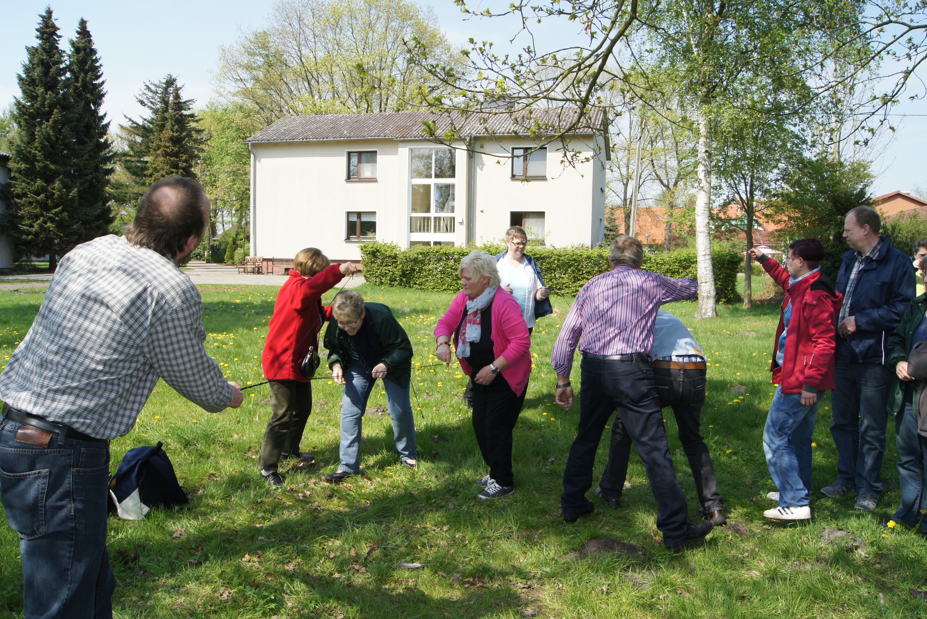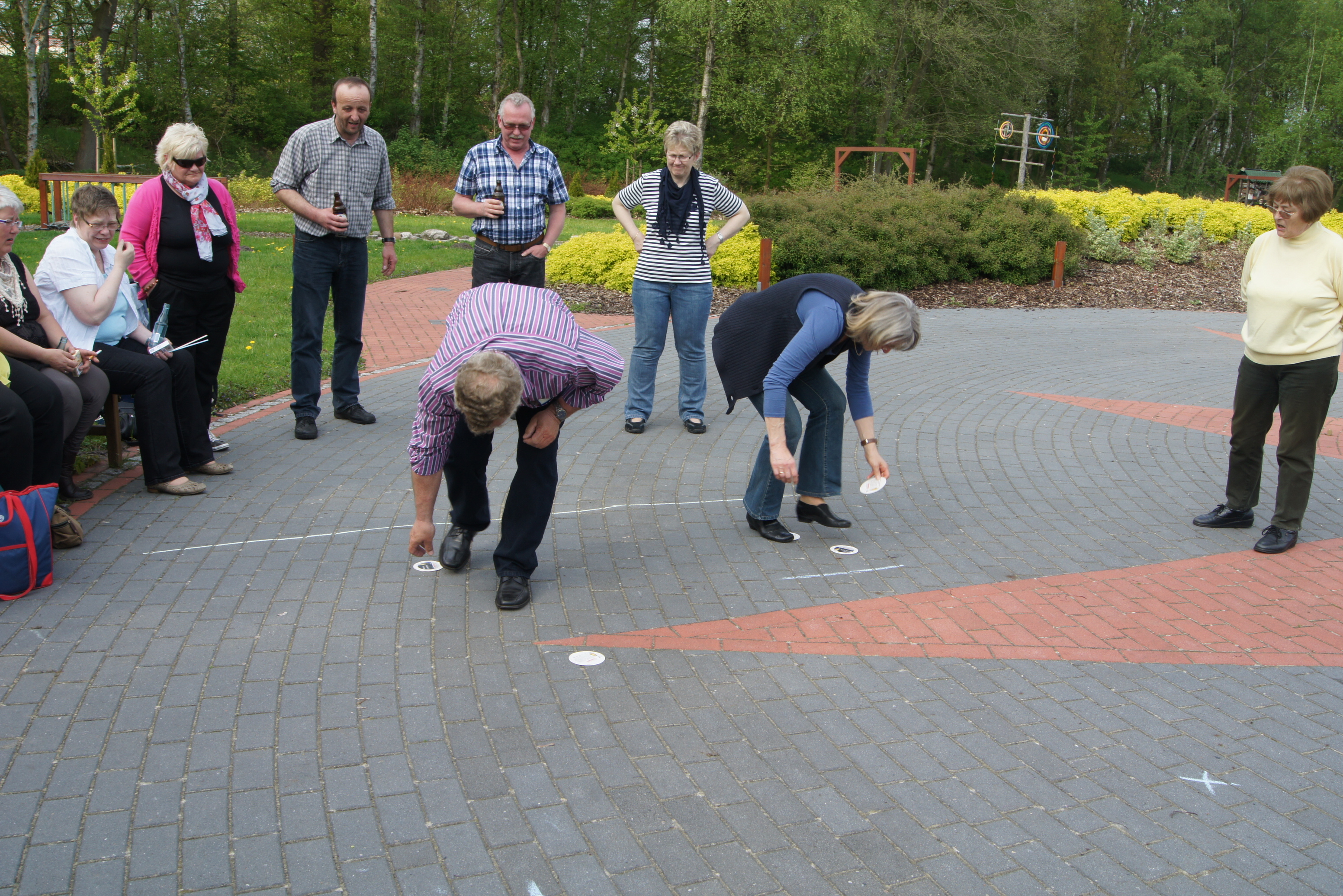 Nach einem kurzen Aufenthalt ging die Fahrt wieder zurück Richtung Freistatt, wo die Gruppe sich im Café beim Backhaus mit Kaffee, Kuchen und Schnittchen stärken konnte. Anschließend ging es dann raus in den Sinnesgarten. Auch hier wurden ein paar lustige Spielchen absolviert. Es wurde sich beim Streichholz pusten, Kartoffelbilliard oder Bierdeckellauf gemessen und die Lachmuskeln wurden dabei ordentlich strapaziert.Natürlich blieb auch genügend Zeit, um die wunderbaren Stationen im Sinnesgarten auszuprobieren oder eine Runde auf der Draisine zu strampeln. Manch ein fremder Beobachter hat mit Sicherheit auch über die Damen der Truppe geschmunzelt, die sich urplötzlich in Kindheitserinnerungen wiederfanden und einen flotten Sprung auf die Seilbahn wagten.