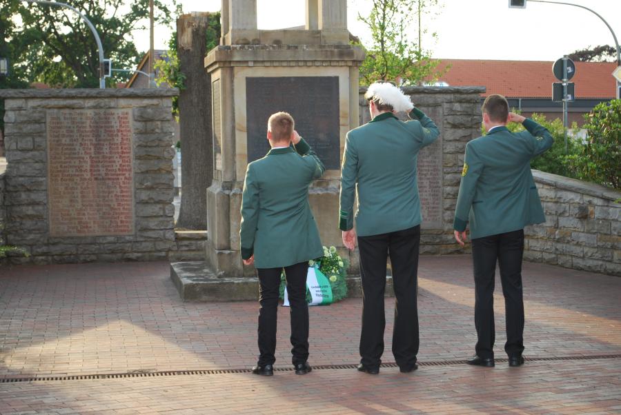 Der Ausmarsch führte die Schützen zum Kriegerdenkmal an der Kirche. Hier sind auf der Erinnerungstafel die Gefallenen der letzten beiden großen Kriege namentlich aufgeführt.