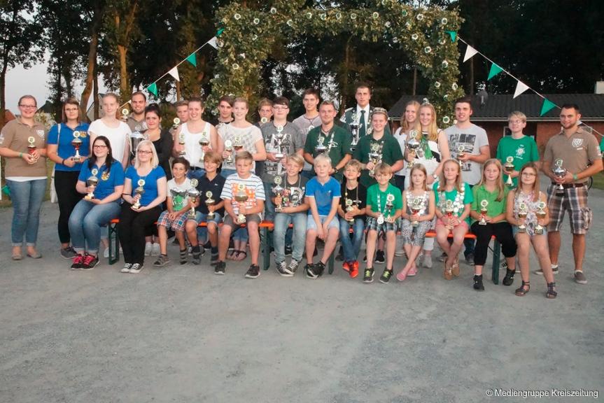 Bei der abendlichen Proklamation der neuen Würdenträger des Schützen-Nachwuchses wurden zudem zahlreiche Trophäen an die bestplatzierten Mannschaften und Einzelschützen vergeben. Der Pokal der Kreissparkasse „wanderte“ für ein Jahr in den Pokalschrank des Schützenvereins Klein Lessen. Beim ganztägigen Luftgewehrschießen waren 126, beim Lichtpunkt-Wettbewerb 37 und beim Wanderpokalschießen 42 Mannschaften am Start. Mit einer „House-über-Kopf“-Party leiteten mehrere hundert Jugendliche in der Nacht zum eigentlichen Kreiskönigstreffen über.