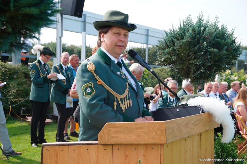 Stellvertretender Landrat Werner Schneider hielt es ultrakurz: „Ich hoffe Ihr alle habt vor dem Antreten heute Eure Bürgerpflicht erfüllt und seid wählen gegangen.“ Axel Knoerig outete sich als vierfaches Mitglied in Schützenvereinen und wünschte gutes Gelingen und Karl-Heinz Klare resümierte schon zur Hälfte der Proklamation und des Festaktes: „Ich habe noch nie so eine gute Organisation gesehen.“ Ein doppeltes Lob ging an Rehden. Karl- Friedrich Scharrelmann, Präsident des Bezirksschützenverbandes, legte den Finger ein wenig in die Wunde: „Großartige Veranstaltung, hier wäre meine Rede eigentlich zu Ende. Aber mir liegt noch ein Punkt am Herzen: Wir sind in den Medien, wenn es um Missbrauch von Waffen geht immer die Sündenböcke. Das ist einseitig gedacht. Derzeit siegen Sportschützen in Rio und wir sind die anständigen Sportschützen und Traditionalisten.“