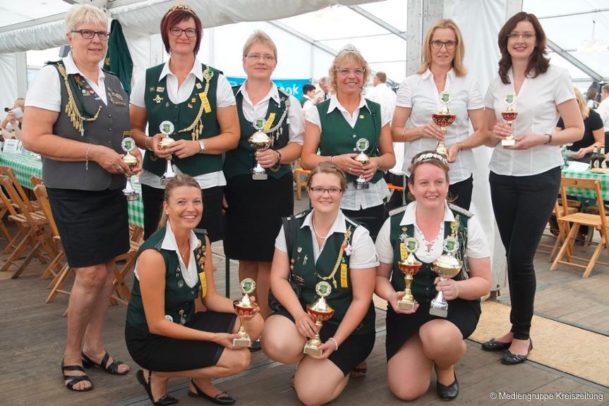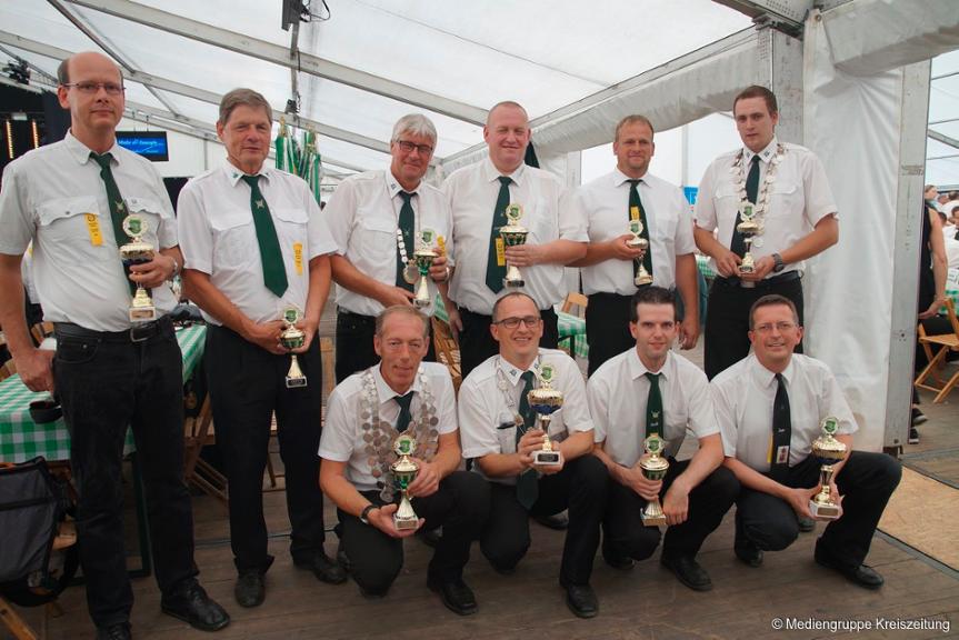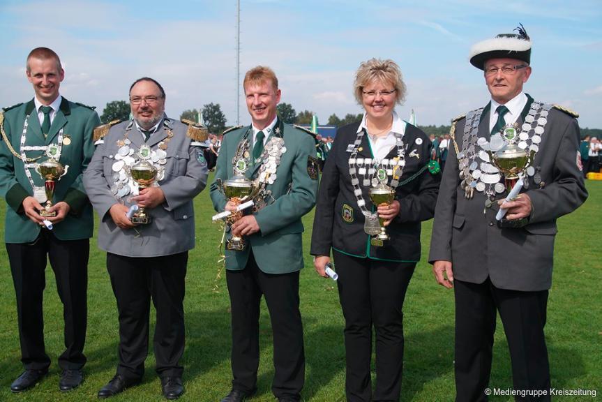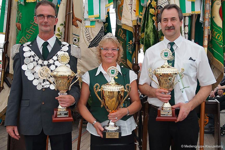 schlechteren Stechteiler geschossen. Andreas Albers legte seinem Nachfolger die Kreiskönigskette um, und die Rehdener Schießwarte zeichneten das erstplatzierte Quintett mit Erinnerungstrophäen aus. Im Festzelt ging es mit dem „Pokalregen“ munter weiter. Die besten Mannschaften der Schießwettbewerbe erhielten ebenso Trophäen wie die erstplatzierten Einzelschützen und –schützinnen. Bei den Wanderpokalschießen gelang Rüdiger Jahn vom gastgebenden Schützenverein Rehden das Kunststück, seinen Vorjahreserfolg zu wiederholen. Er wurde erneut „Kreiskönig der Kreiskönige“. Der Wanderpokal für Schützen-Teams ging an die Schießgruppe der Maifeier Sankt Hülfe-Heede, während der Cup für Damenmannschaften in den Pokalschrank des Schützenvereins Hemsloh „wanderte“.
