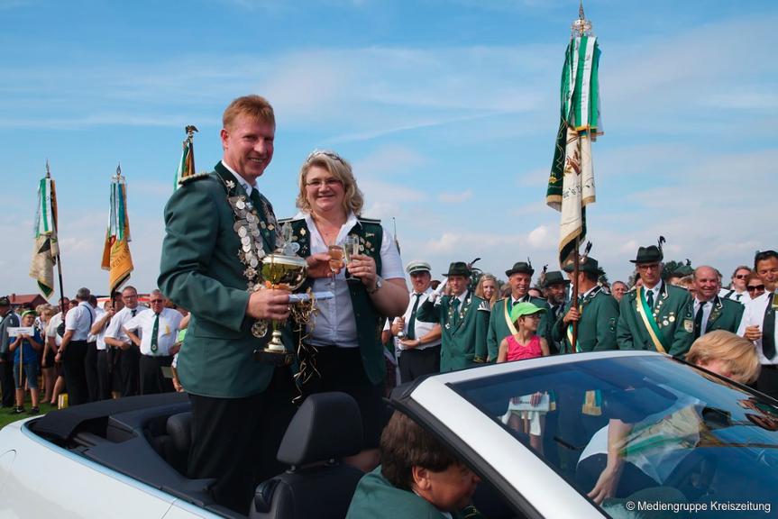 Du darft das Cabriolet bei Deiner Frau Marina anhalten lassen“, der Tipp von Präsident Thomas Nowak, Chef des Ausrichtervereins des 57. Kreiskönigstreffens in Rehden. Als neuer Kreiskönig war Carsten Drafz vom Schützenverein Heerde-Kuppendorf in das Ehrenfahrzeug gestiegen.